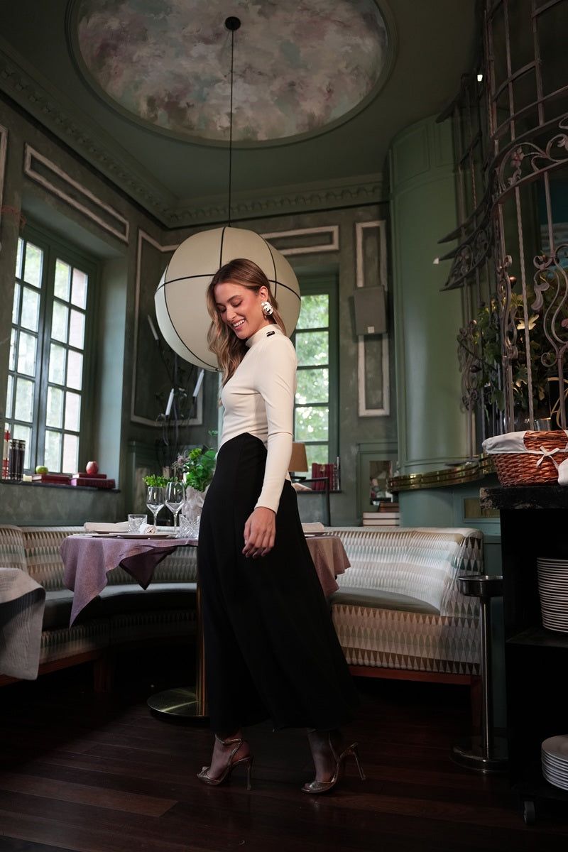 Este vestido bicolor en crudo y negro, fabricado con 90 % poliéster y 10 % elastano, combina elegancia y comodidad. Su tejido elástico se adapta perfectamente al cuerpo, resaltando la figura mientras ofrece libertad de movimiento. Ideal para quienes buscan un look sofisticado y versátil, apto para diversas ocasiones.