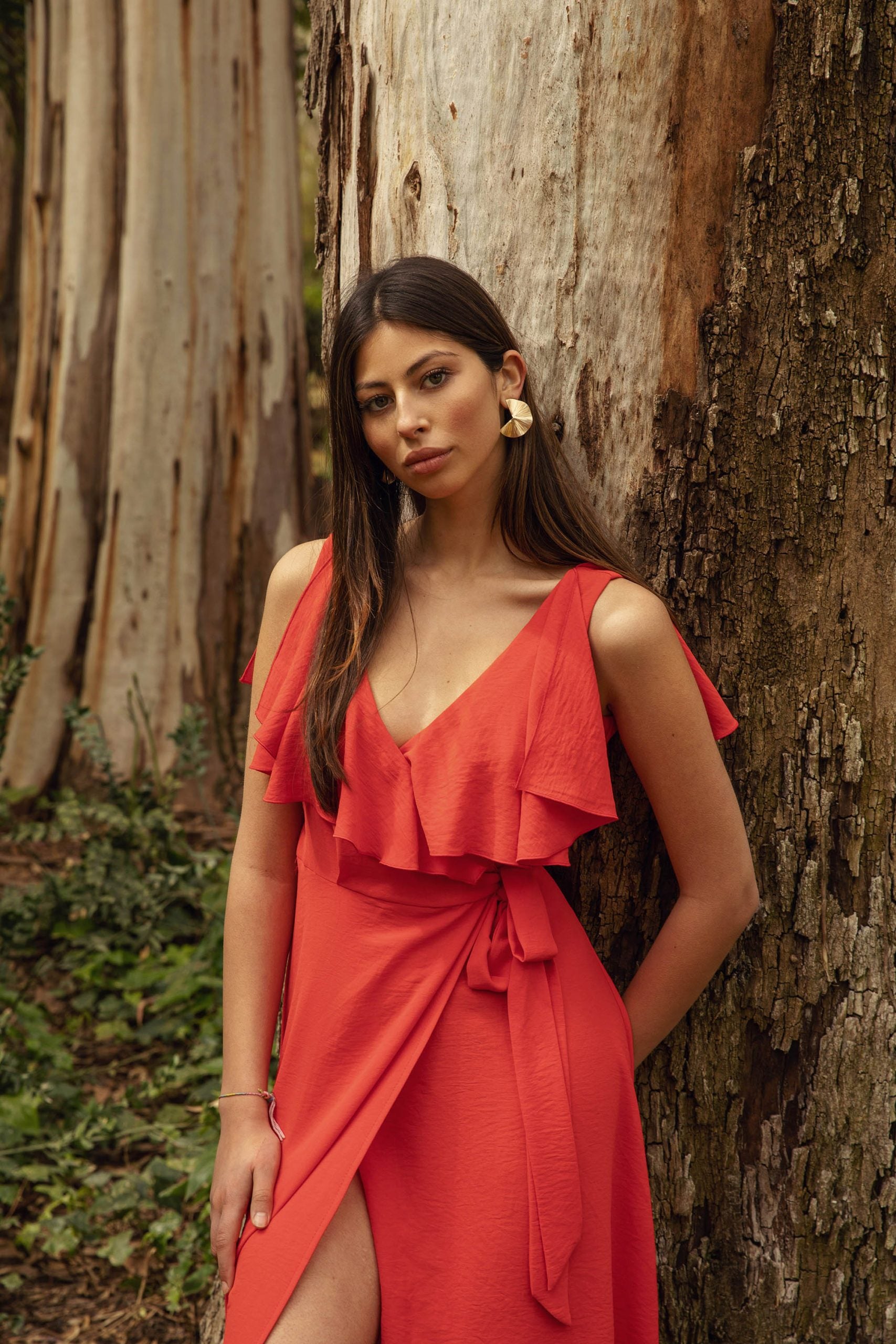 Vestido cruzado anudado en cintura en tejido vaporoso. Largo midi y volantes en escote. Composición: 100 % poliester-polyester